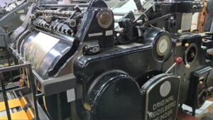 昔ながらの輪転機という蒸気機関車のような機械を前に打合せ。